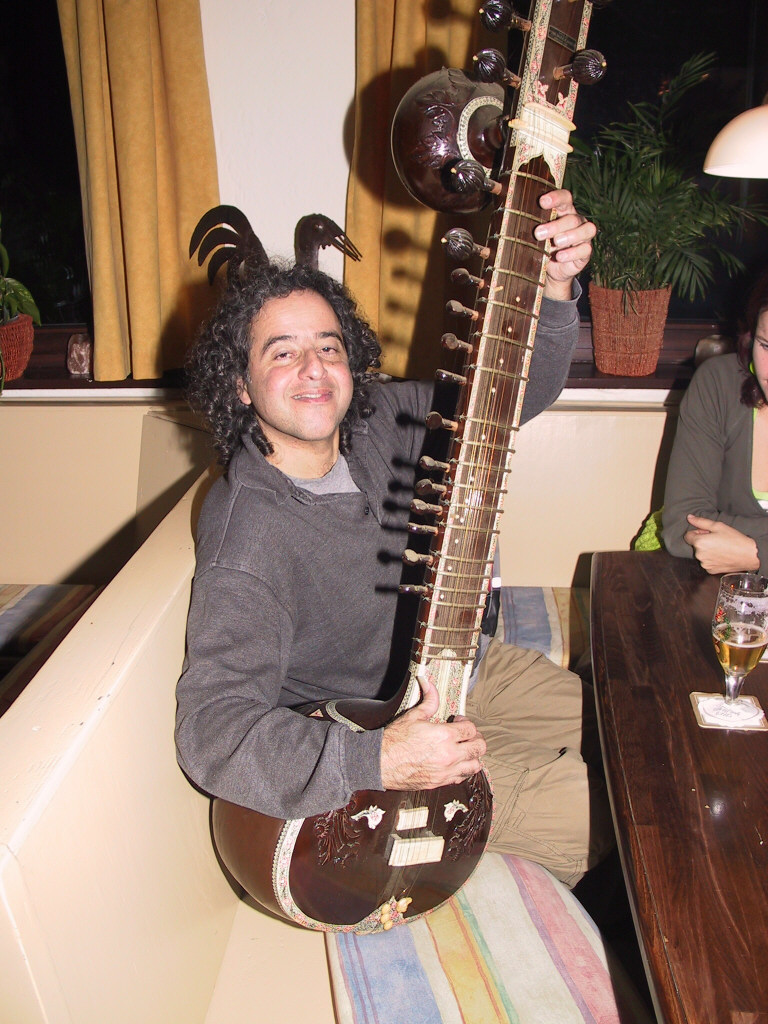 Abaji lässt nach seinem Auftritt in der Kleinkunstbühne wieder mal die Eulen-Sitar klingen... |