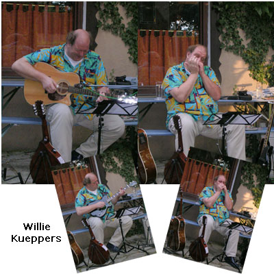 Lässiger Blues im BiergartenJa, das hat schon was: an einem lauen Sommerabend im Biergarten sitzen und unaufdringlich-lässigen Blues und Country zum Bierchen hören.So war's an einem August-Mittwoch 2004 im Schongauer "Eulenspiegel", als sich das Duo "Wailing Willie" im Freien einen abzupfte. Willi Kueppers und Bernd Rinser gelang es, einen groovigen Mix aus Chicago-Blues, swingenden Songs, Soul und New-Orleans-Feeling rein akustisch für die ca. 40 sehr aufnahmefreudigen Besucher zuzubereiten. Prägnante Stimmen, fetzige Blues-Harp und flirrende Slide-Gitarren waren die Markenzeichen dieser, sich an klassischen Vorbildern orientierenden Eigenkompositionen. Die Atmosphäre zwischen Band und Publikum war fast privat, durch die kabarettistischen Ansagen der beiden Musiker entwickelte sich schnell ein spontaner Austausch, der den einen oder anderen Lacher durch die Biergartenbüsche trieb. Es war einfach unerwartet nett, so dass derartige Spontankonzerte ruhig öfter mal stattfinden könnten... |