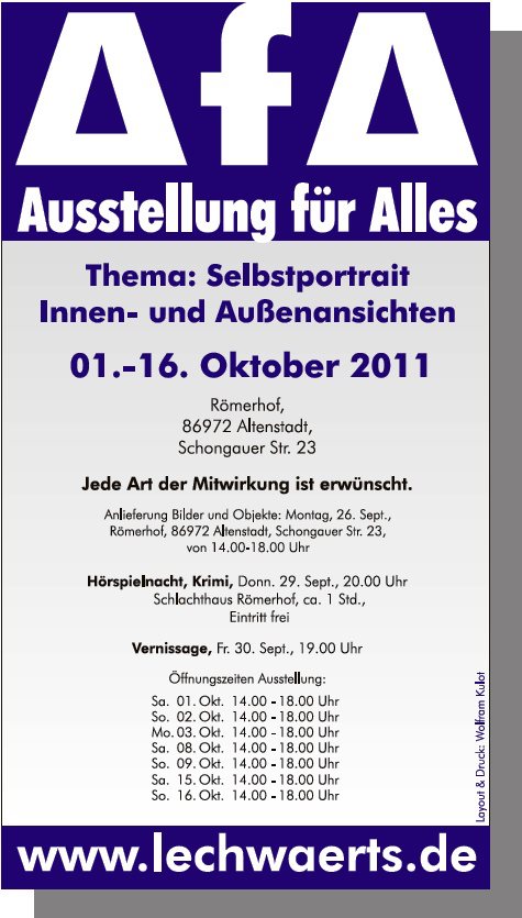 Altenstadt - "Erkenne dich selbst!" und mach ein Kunstwerk draus war im weitesten Sinne das Motto der diesjährigen Ausstellung für Alles (AfA) zum Thema "Selbstbildnis - Innen- und Außenansichten". Am vergangenen Freitagabend wurde die Schau mit einer Vernissage samt Live-Musik und Buffet im Römerhof eröffnet.