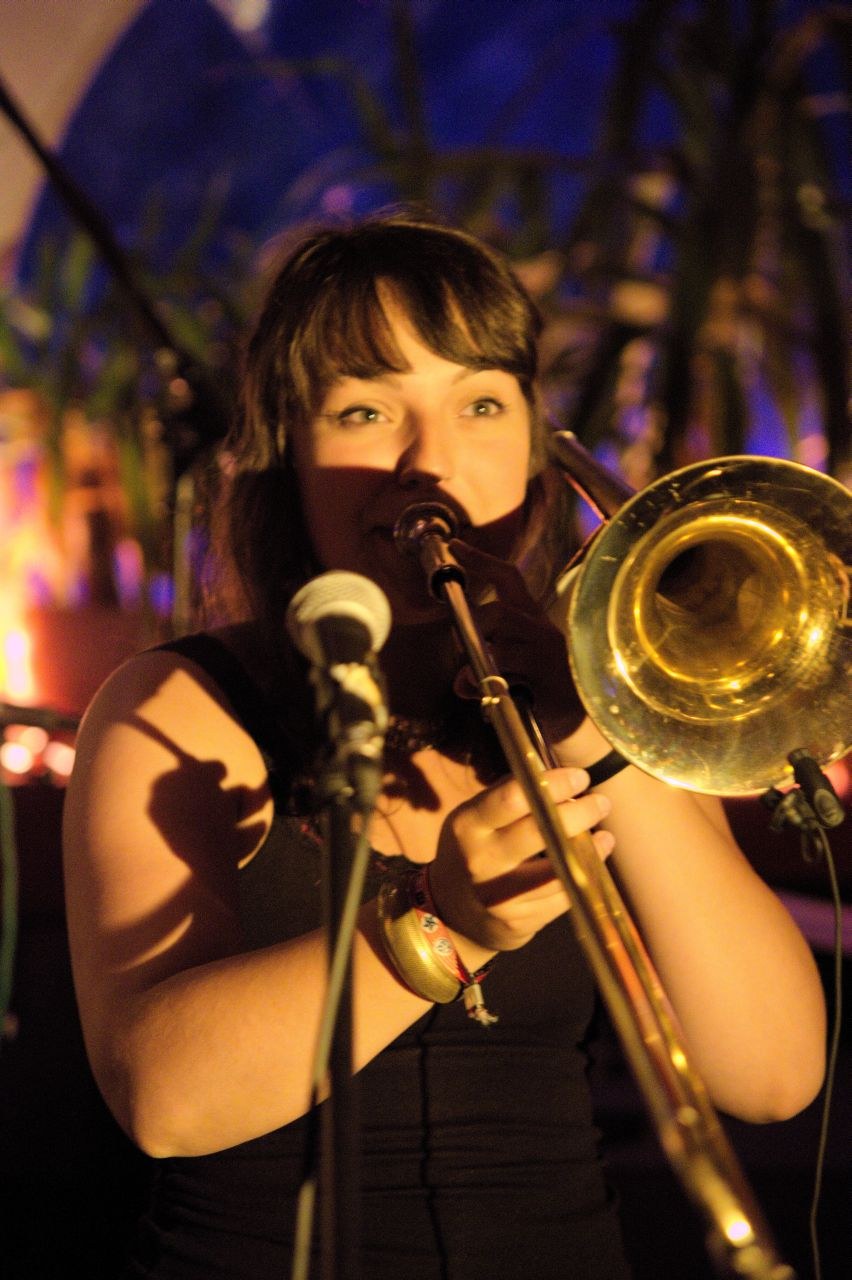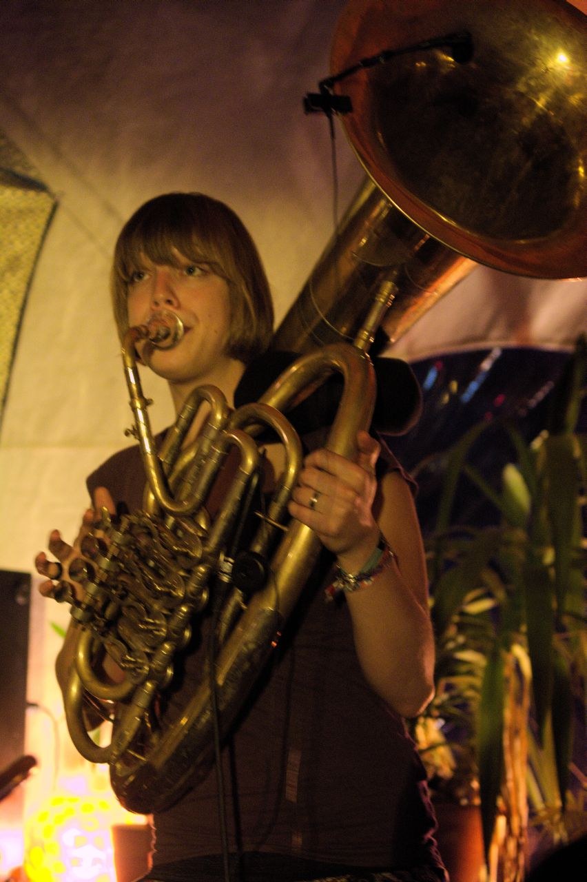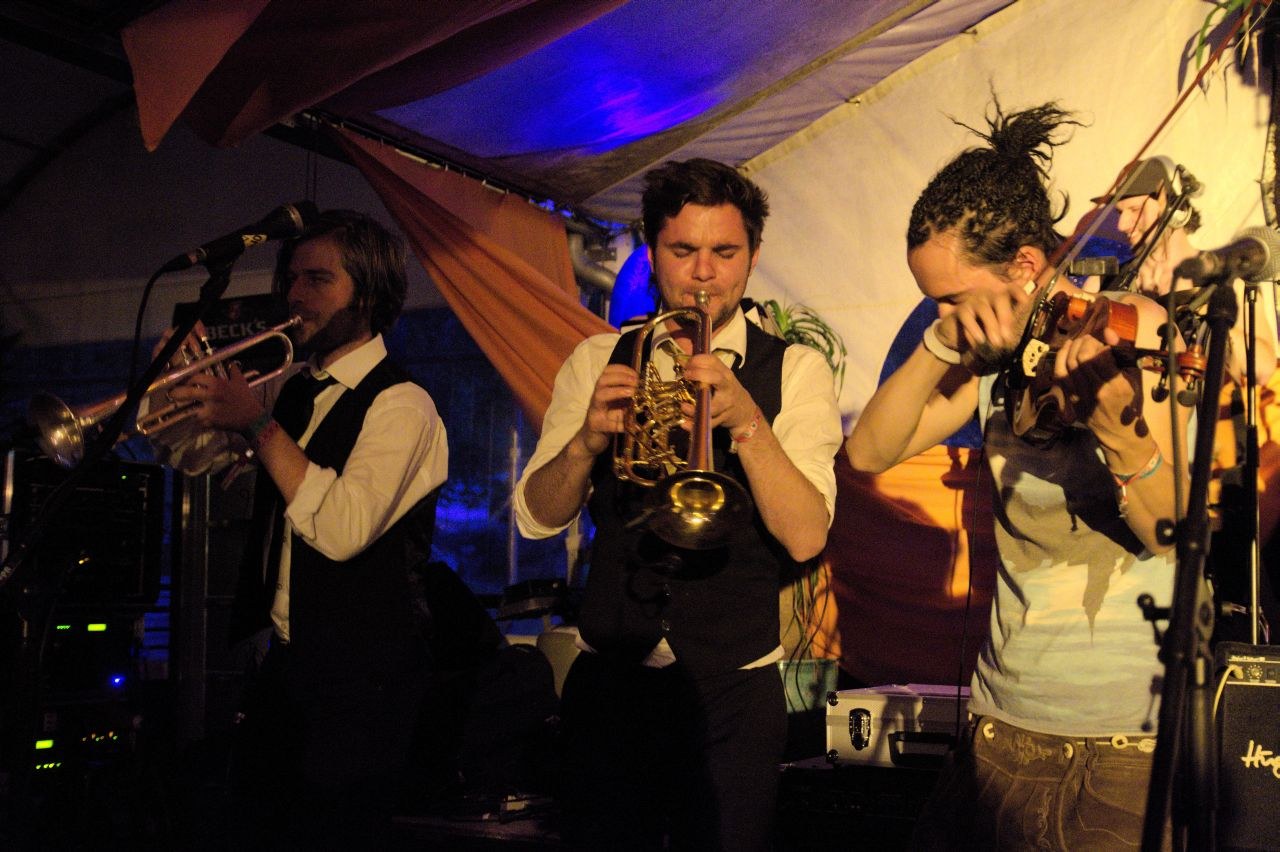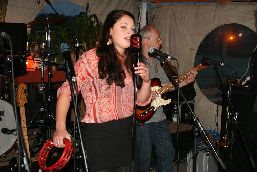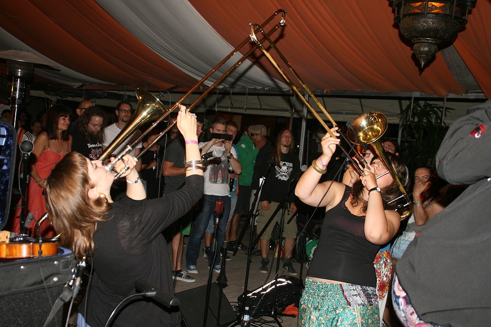 Einen krassen Gegenpol zu der eher ruhigen Lounge-Musik bildete anschließend die Gruppe Donnerbalkan, bestehend aus zehn Münchener Musikstudenten. Der Name versprach nicht zu viel: Ganz den Balkan-Rhythmen verschrieben, fuhren die jungen Vollblutmusiker mit Posaunen, Trompeten, Pauken und Akkordeon mächtig auf. Erfrischend und mit jugendlichem Charme interpretierten sie Liedgut aus dem wilden Osten Europas. Musik, die mit viel Temperament und Gefühl daherkommt und den Zuhörern unweigerlich ins Tanzbein schießt. Kein Wunder, dass sich die bis dato leere Tanzfläche schnell füllte, und flugs die Tische auf die Seite geräumt wurden.