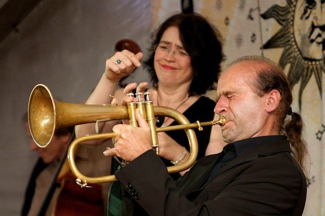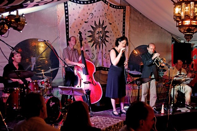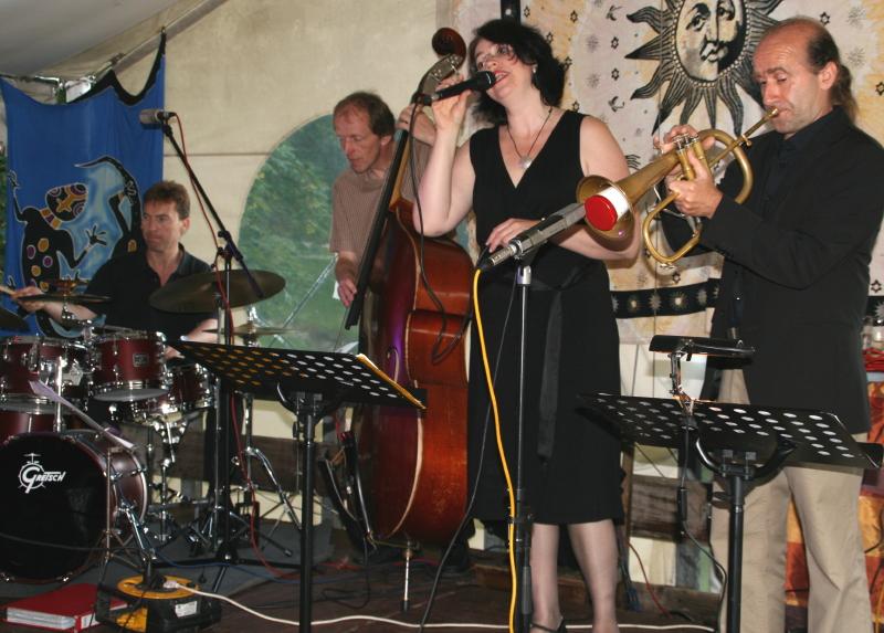 Selbst dem deutschen Schlager "Ich will keine Schokolade" verlieh sie eine ganz eigene Interpretation. Mia Weirich, die für ihre lyrische, tragende Stimme bekannt ist improvisierte aber ebenso munter drauf los und brachte mit gesungenen Schlagzeug-Rhythmen das Publikum so richtig zum swingen. Wo Mia Weirich stimmlichen Zuckerguss verbreitete, setzten der Ungar Laszlo Demeter mit druckvollen Schlagzeugwirbeln und Stefan Sigg mit Virtuosität und langem Atem am Flügelhorn energische Kontrapunkte. Tiny Schmauch, der Kontrabassist aus Kaufbeuren glänzte immer wieder mit einfühlsamen und gefühlvollen Spiel, mit dem er auch das eine oder andere Solo unterstrich und lieferte außerdem abwechslungsreiche und spannungsgeladene Improvisationen. Gitarrist Peter Decker vervollkommnete schließlich mit klangvollen Soli, bei denen er seine Finger schlichtweg über die Saiten tanzen ließ. Abwechslungsreich gestaltete Mia Weirich den Abend, wobei sie ganz tief in die Songkiste griff und dabei allerhand ans Licht beförderte von Roberta Flacks "Feel like Makin' Love" über Abbas "Thank you fort he Music" oder Duke Ellingtons "Caravan" und dem Sérgio Mendes-Titel "Mas que Nada" bis zur Eigenkomposition "Schau mal!" von Tiny Schmauch. Und das alles in typischen Mia Weirich-Bearbeitungen: Klangvoll, leidenschaftlich und sanft swingend. Das Publikum zeigte sich jedenfalls begeistert von dem Konzert-Ereignis, wozu sicher auch die romantische Kulisse am Lechsee mit Kerzenlicht und Mondenschein das ihre beitrug. Die Band durfte nicht ohne drei Zugaben von der Bühne, wozu sie sich aber durch den stürmischen Applaus gerne überreden ließ. (Text & Foto: Ursula Fröhlich)