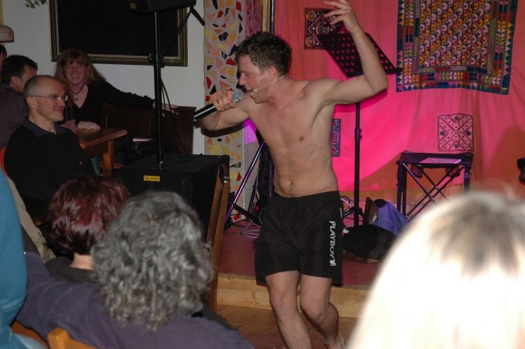 Wenn ich könnte und würde, wie ich wollte, oder sollte, aber ich mache es dann doch nicht und außerdem habe ich sowieso keine Zeit, und was ich noch sagen wollte, ich muss erst einmal meinen Google-Kalender befragen und überhaupt….: Ein wahres Feuerwerk an Gedankensprüngen und das Ganze in rasanter Sprechgeschwindigkeit – das war der Auftritt von Nepo Fitz in der Schongauer Kultkneipe Eulenspiegel.