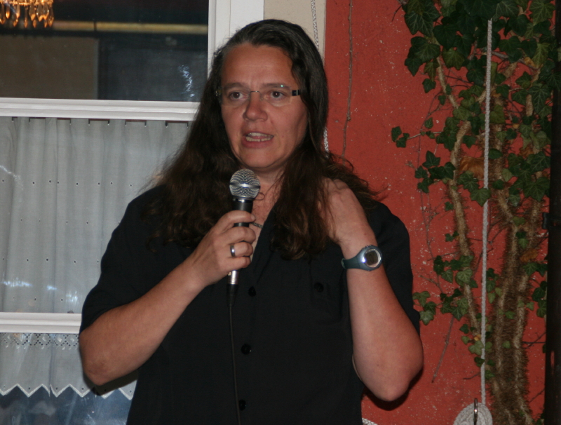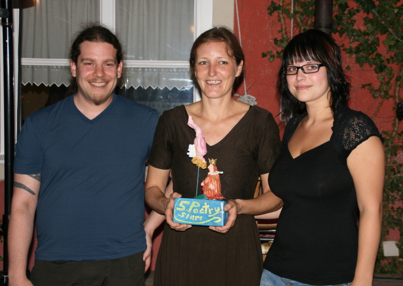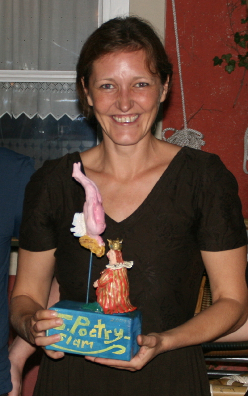 "Ich habe noch nie einen Poetry-Slam gesehen und heute zum ersten Mal mitgemacht.", erzählte Felizitas Arneth, die dafür einen erstaunlich professionellen Auftritt hingelegt hatte. Unter dem Motto "Hausfrauen-Report" legte sie mit Schnell-Sprech-Talent eine atemlose Gedicht-Prosa-Kollage vor, die vom Publikum mit viel Applaus bedacht wurde und ihr schließlich den Sieg einbrachte.